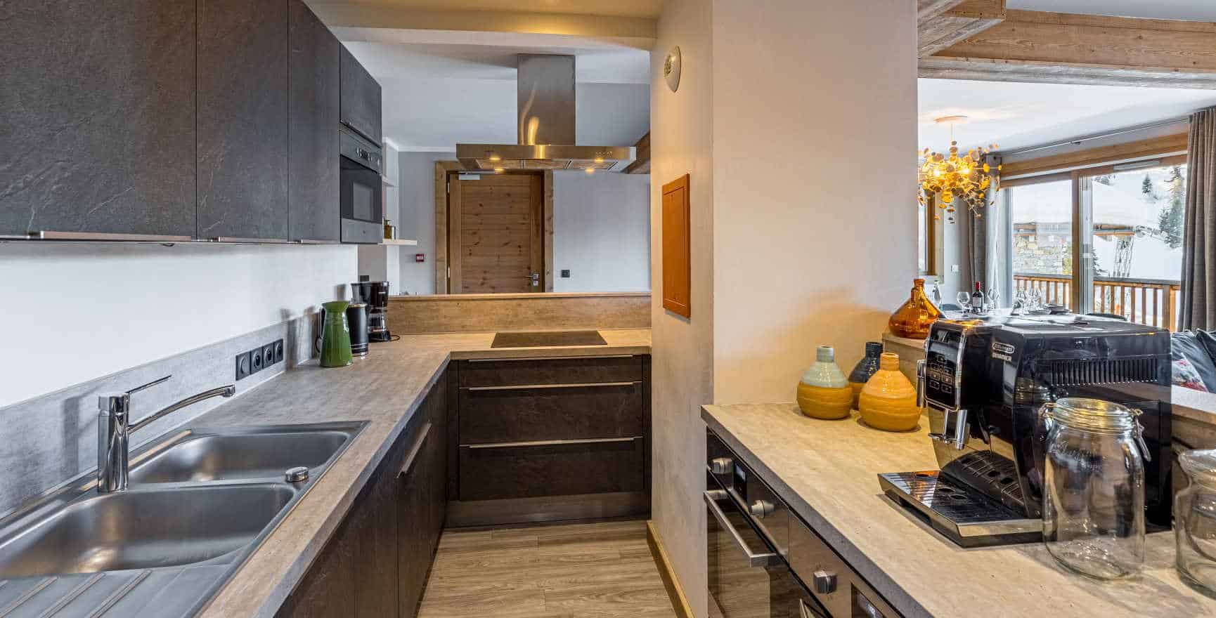 The chalet amenities include a fully-equipped kitchen with a large dining table and board options including the Carlina Hotel’s gastronomic restaurants.