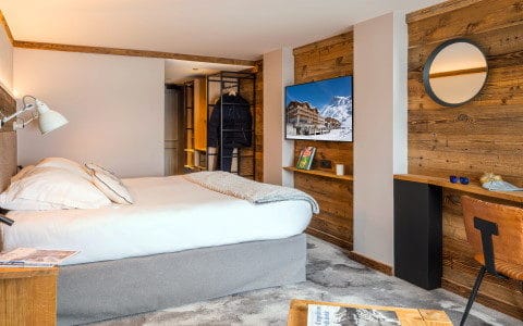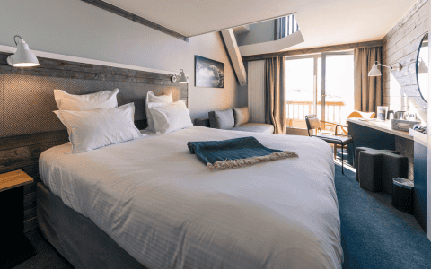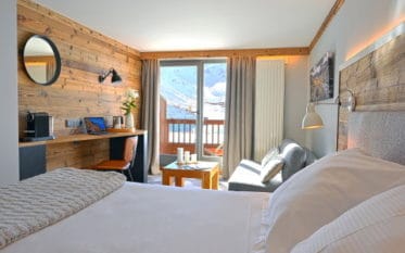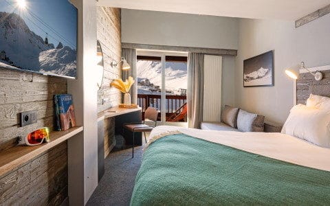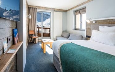 Chambre orientée nord ou sud avec vue sur le village, les pistes ou le glacier de la Grande Motte. Composée d’un lit double 180×200 convertible en 2 lits simples 90×200 ainsi que d’un canapé-lit pour 1 personne, d’une salle de bain ou douche avec toilettes, d’un mini-bar et d’un balcon privé. Chambre d’environ 24m² pour 1 à 3 personnes. Parfait pour 2 adultes, confortable pour 3 adultes ou 2 adultes et 1 enfant.