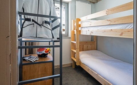 Chambre avec balcon, orientée Sud-Ouest avec vue sur les pistes, le lac, le glacier de la Grande Motte et les montagnes de Palafour. Composée d’un lit double 180×200, de 2 lits superposés, d’une salle de bain avec toilettes séparées et d’un balcon privé. Chambre d’environ 32m² pour 2 à 4 personnes : parfait pour 2 adultes et 1 enfant ou 2 adultes et 2 enfants, confortable pour 4 adultes.