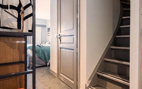 Suite vue Montagnes et Village composée de 4 chambres, dont deux l’une au-dessus de l’autre, reliées un par escalier assez raide.
